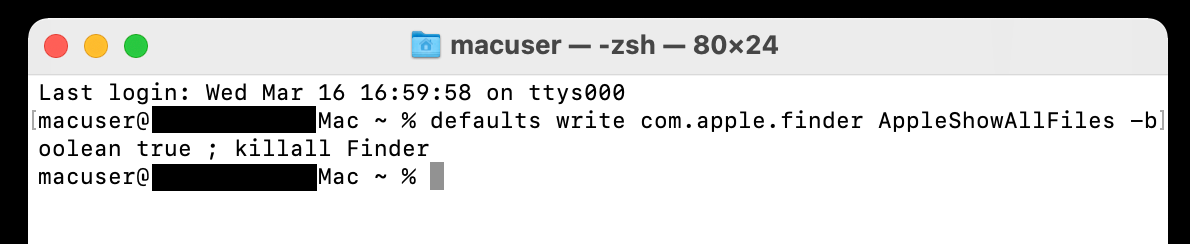 | OS X 10.9以降のMacをご使用の場合: defaults write com.apple.finder AppleShowAllFiles -boolean true ; killall Finder |