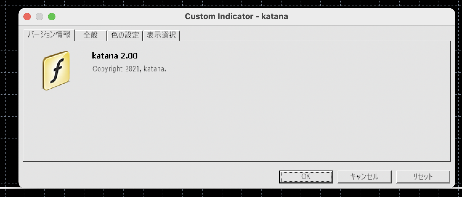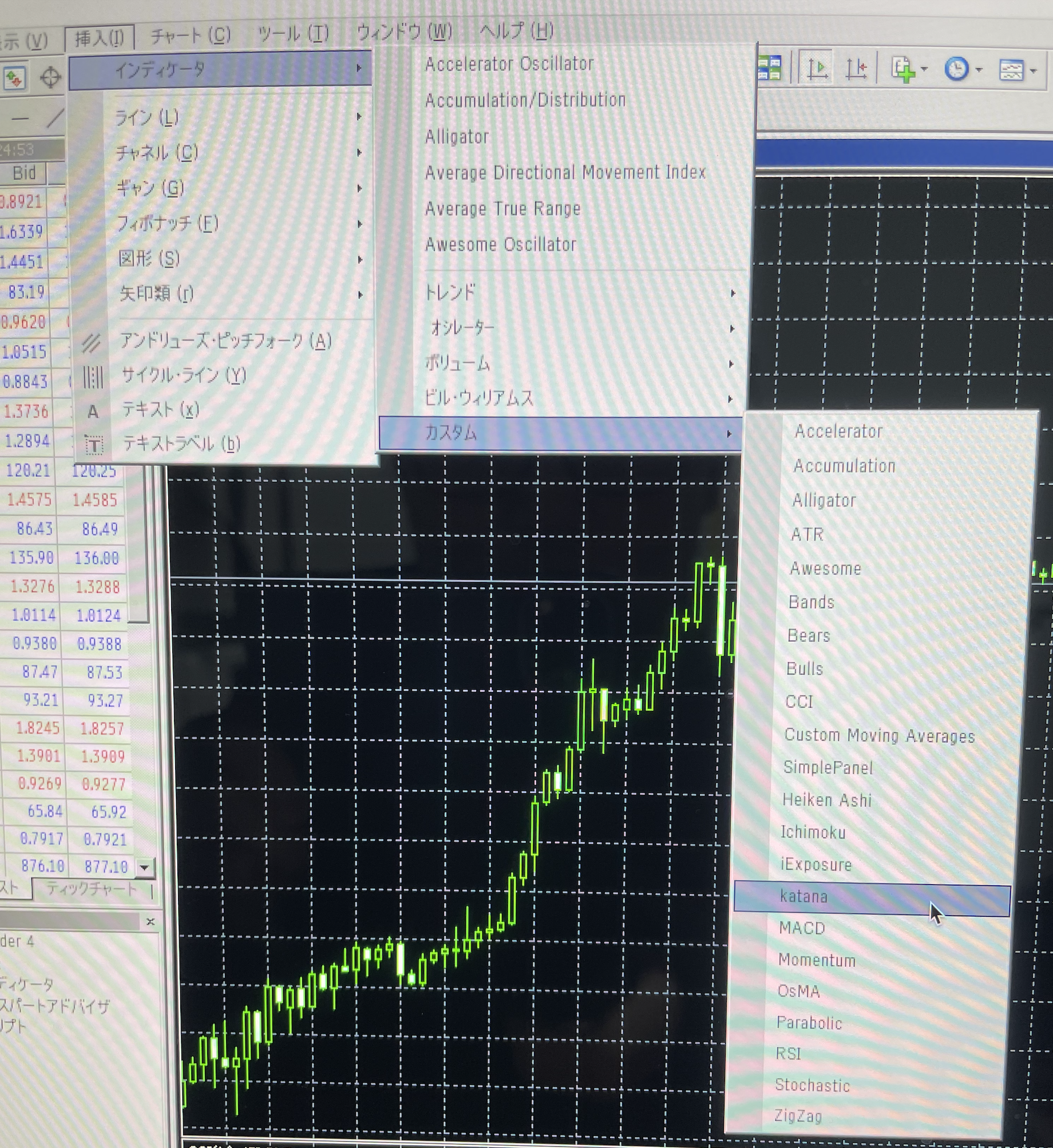挿入→インディケータ→カスタム→Katanaという流れで進み、クリックします。