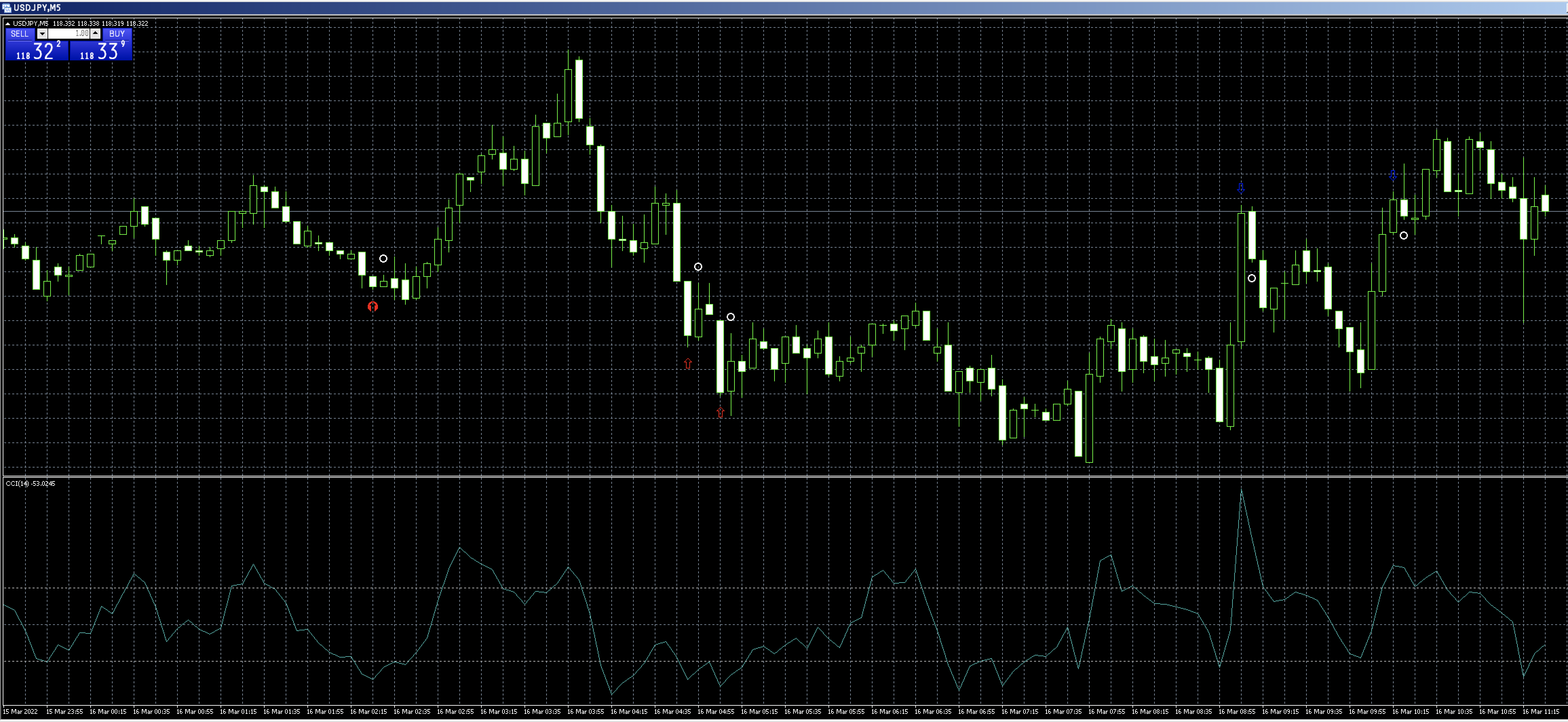 導入されましたら、5分足を選択すると、「Katana」が反映されています。