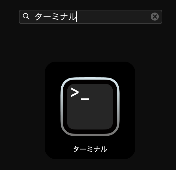 ①DockでLaunchpadのアイコンをクリックして(もしくは cmd + space)、検索フィールドに「ターミナル」と入力してから、「ターミナル」をクリックします。