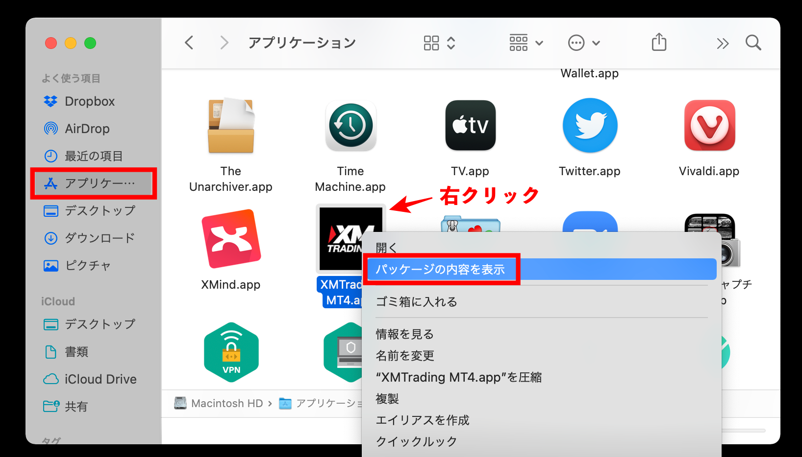 Finderで、Macのアプリケーションフォルダを開く